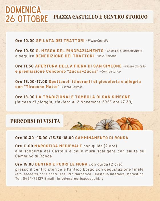 I agree I disagreeThe ancient festival known as Fiera di San Simeone takes place every last Sunday of October. The festival is dedicated to patron Saint of Marostica and it is also sort of a thanksgiving celebration at the end of the agricultural season. Markets of typical products, music and folk dances celebrate the rite of the blessing of autumn fruits, tractors and transhumance. The Fiera di San Simeone festival is still strongly linked with the ancient tradition of transhumance that in our days too takes place along the Arzeron della Regina, the flock road, which crosses Marostica going through Piazza Ortigara square and continues along the Sejo path until the hamlet of Crosara, then heading for the pastures of the Asiago Plateau. The rite of transhumance is recalled every year, during the festival, with a parade of Rendena cows along Corso G. Mazzini, attracting the curiosity and enthusiasm of adults and children alike.