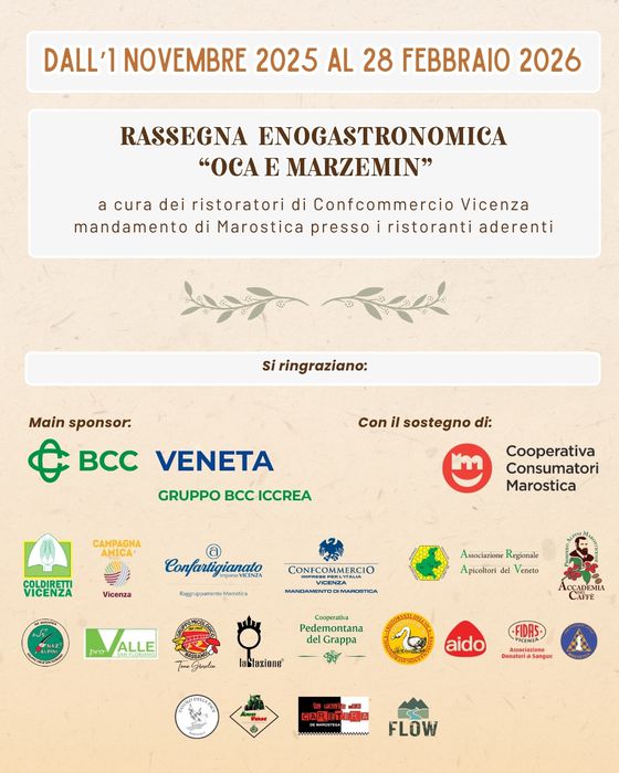Last but not least, the typical Venetian dish that cannot be missed: the goose skewer, which is freshly prepared and served in the square, accompanied by Marzemino wine. This food specialty has its roots in our gastronomic tradition and it is now experiencing a new life in the Vicenza area, thanks to the efforts of the restaurant owners in Marostica that belong to Confcommercio (i.e. the Italian Confederation of Commerce, Tourism and Services),. Since 2012 they have been offering a food and wine event called Oca e Marzemin (lit. Goose and Marzemino wine), which has now become a regular appointment for people who love and want to learn about typical dishes and new culinary reinterpretations.
