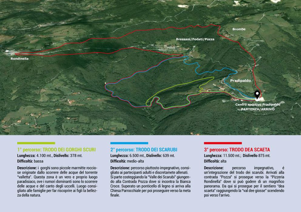 Description: Difficult route, it is an integration of the trodo dei scarubi. Once in the "Pozza" district, continue towards the "Pizzeria Rondinella" where you can enjoy a magnificent panorama. From here continue along the "dea scaeta" path reaching the "val deegiosse" then descending towards the finish.