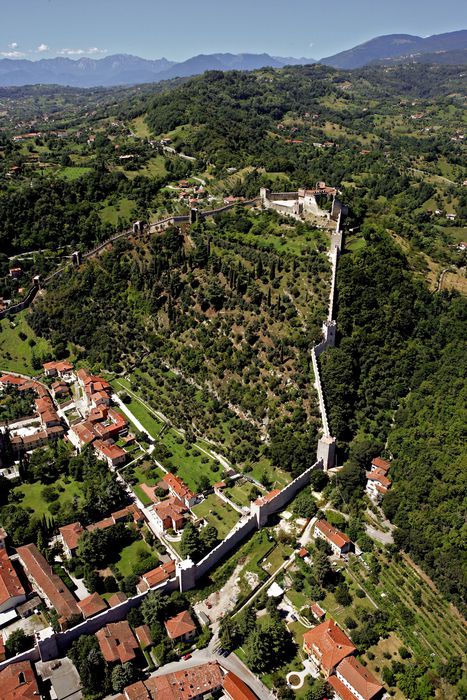 The walls, all crenellated and with chemin de rondes, are interspersed with 24 "torresini" (small towers). The three sturdy gates, Vicentina, Bassanese and Breganzina, which look south, east and west respectively, all have a ravelin (fortification).